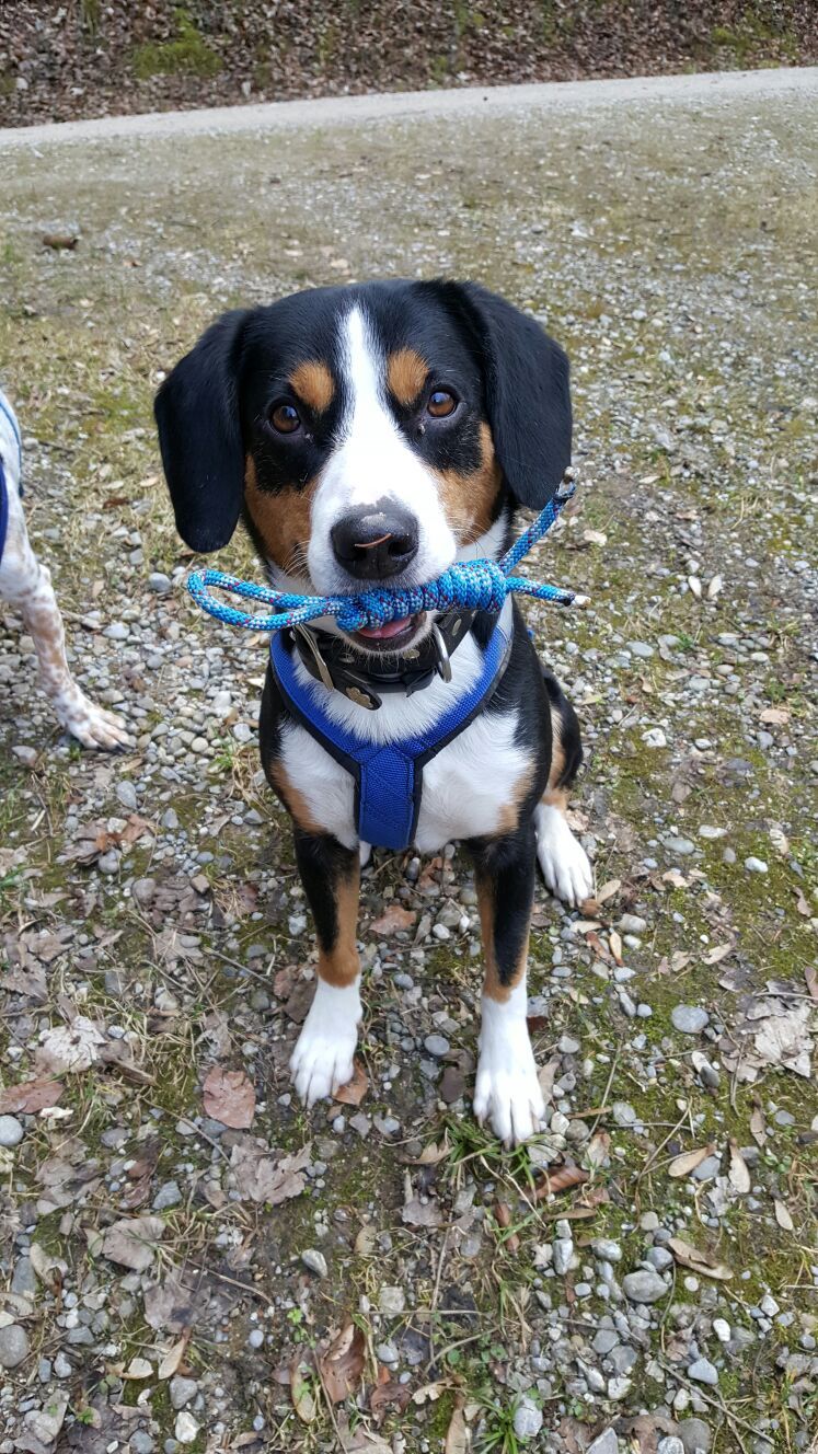 Lenny, unser Entlebucher Sennenhund ohne Papiere, ist der gemütliche Gegenpol. Zuhause verschmust und anhänglich, draussen eigenständig und rassetypisch loyal. Er bewacht zuverlässig „seinen Hof“ – sprich unser Haus – und bringt im Spiel viel Körperlichkeit mit, begleitet von seiner typischen Geräuschfreude.